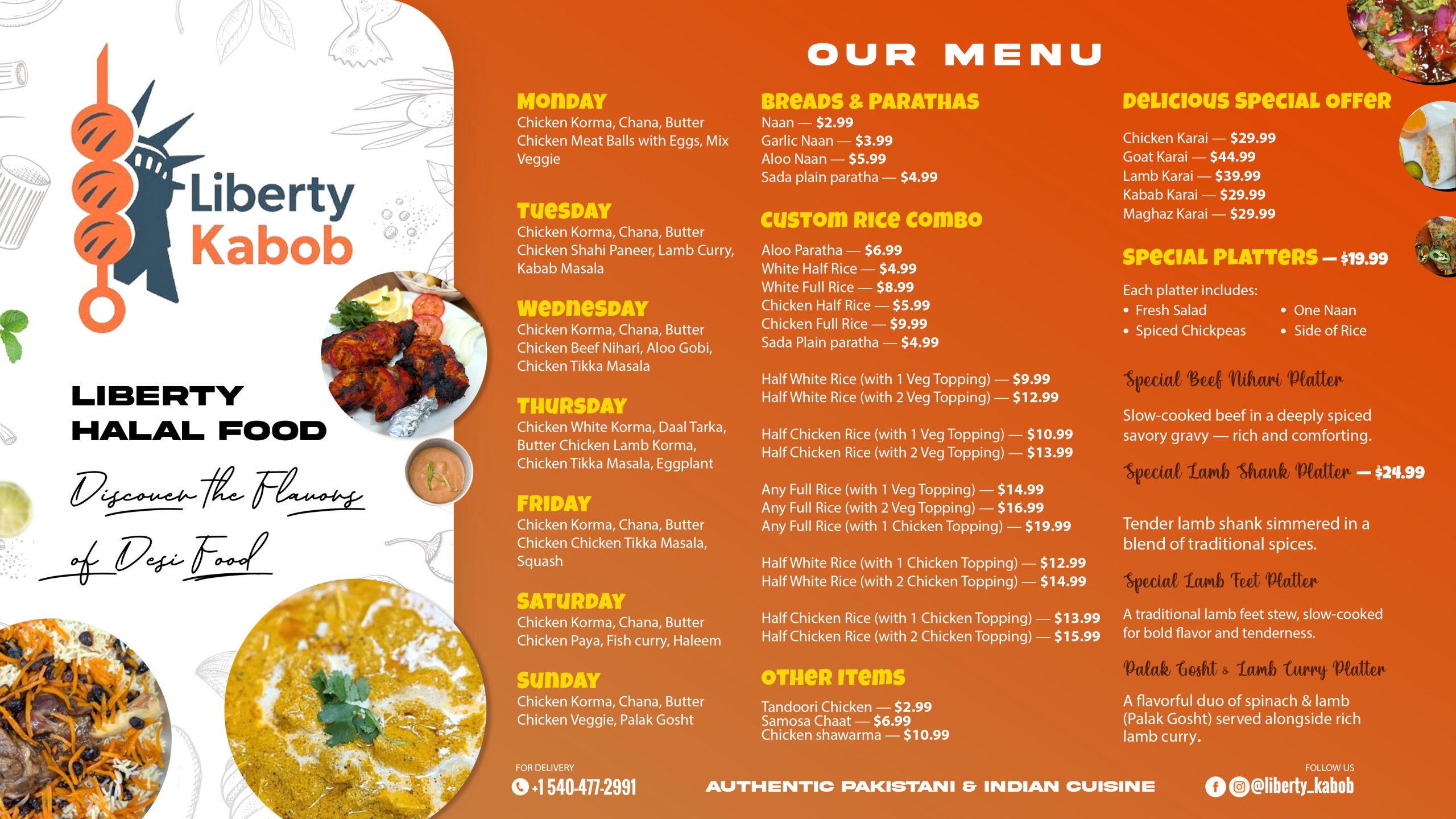 Experience the rich traditions of Pakistani and Indian cuisine with our premium halal dishes at Liberty Kabob, conveniently located inside Liberty Gas Station